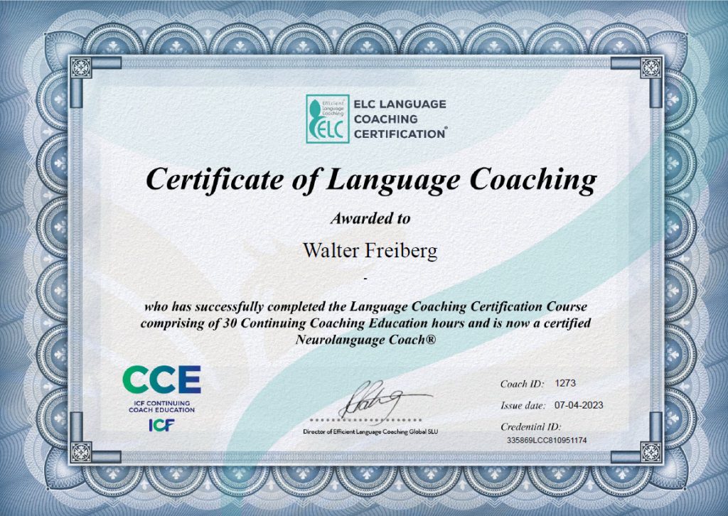 I offer Neurolanguage Coaching® sessions, a modern approach that combines recent neuroscience research on how we learn better, with professional coaching practices that follow the International Coach Federation (ICF) standards, and traditional language teaching. I am certified as a professional coach by Efficient Language Coaching and accredited by the International Coach Federation.
