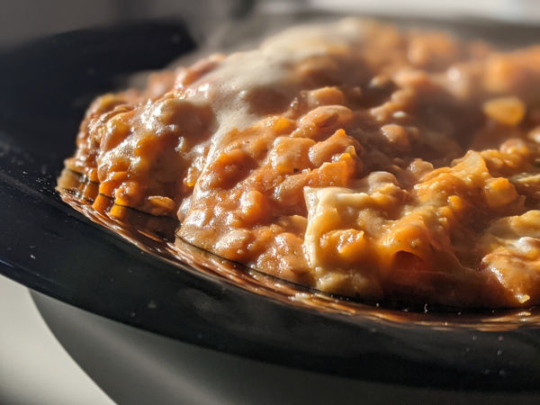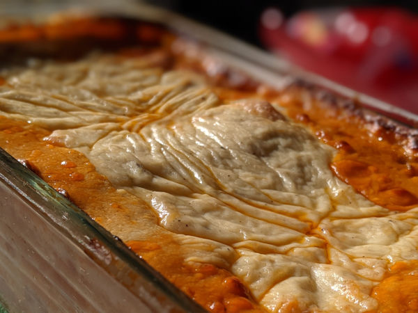 One other thing that surprised me (at least in the few recipes I used as a source for my own version), is that it didn’t have so much cheese as I thought I would find. Actually, it was more about Bechamel sauce, than cheese. But instead of using it just on top, it was spread in between the layers. The main version I used (from “Cucina Botanica”), had a lentil ragù as a meat replacement and a vegan Bechamel.