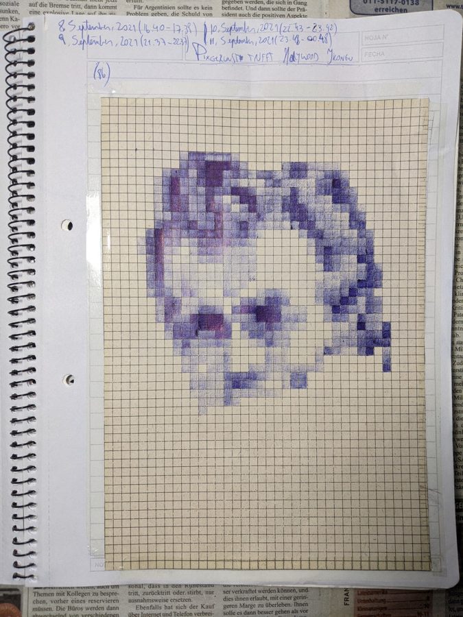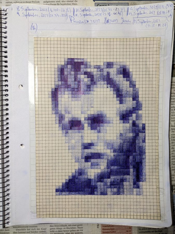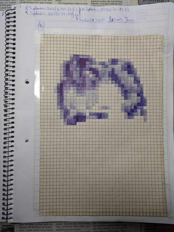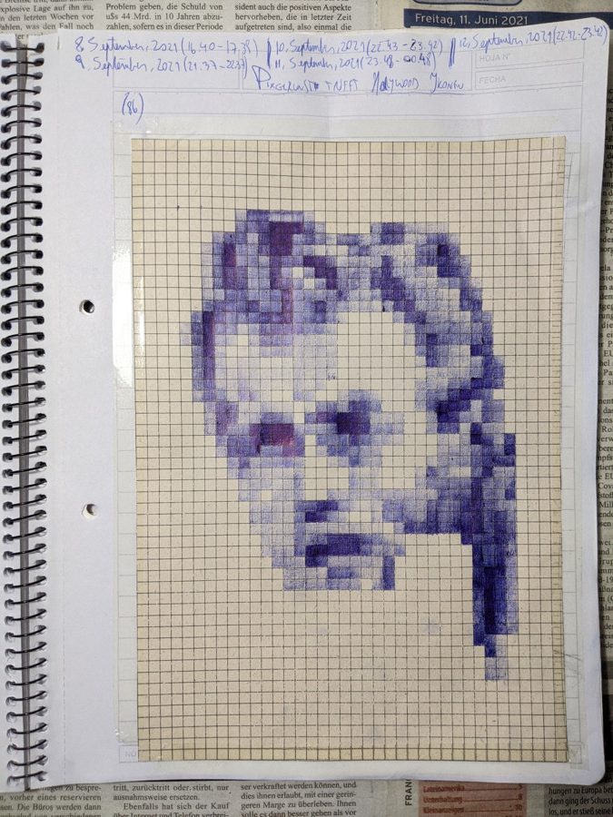 The pixel-art project was by far one of the most entertaining drawings up to this point. It’s like drawing and painting at the same time. The good thing is that I had to use graph paper. The bad thing? I had to use graph paper π . I mean, I had to count squares and calculate shades of blue all the time. That was somewhat tedious, but it was also quite liberating. If I followed the patterns correctly -and if I painted them carefully- I should be able to get a good result. It was a work of patience and endurance!