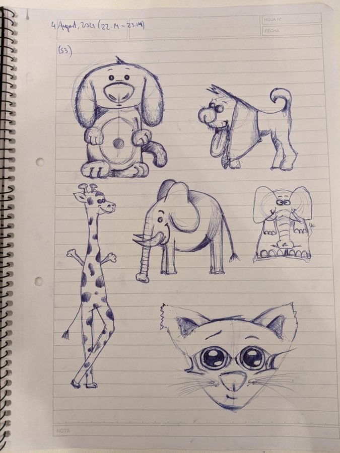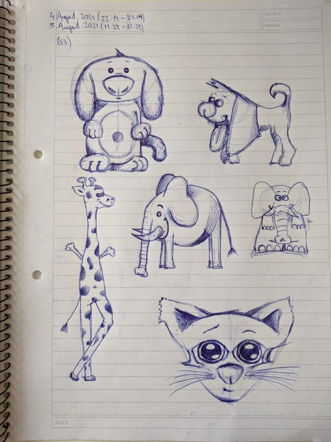 Between Days 34 and 36 I worked on animal cartoons. Loved these drawings! I would like to get back in the future to cats. I especially like drawing these big eyes and the mix of comic-like figures and realistic features. During the last day (Day 36) I also started the Four Characters drawing (which would keep me busy for almost a whole week π ).