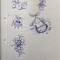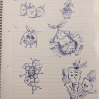 From Day 45 to 47 I worked on surreal fruit and veggie forms. As I mentioned in the first comic drawing article, I have found here as well that the eyes and eyebrows convey most of the mood and the feeling of a character. Even with very small eyes and a couple of lines, is possible to give a lot of expression to these comic figures. Between Days 47 and 50, I worked on a bigger, full-page design with multiple characters. I would even need one more extra day to finish that one.
