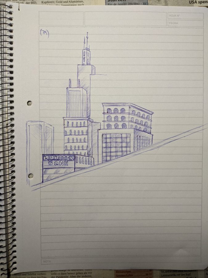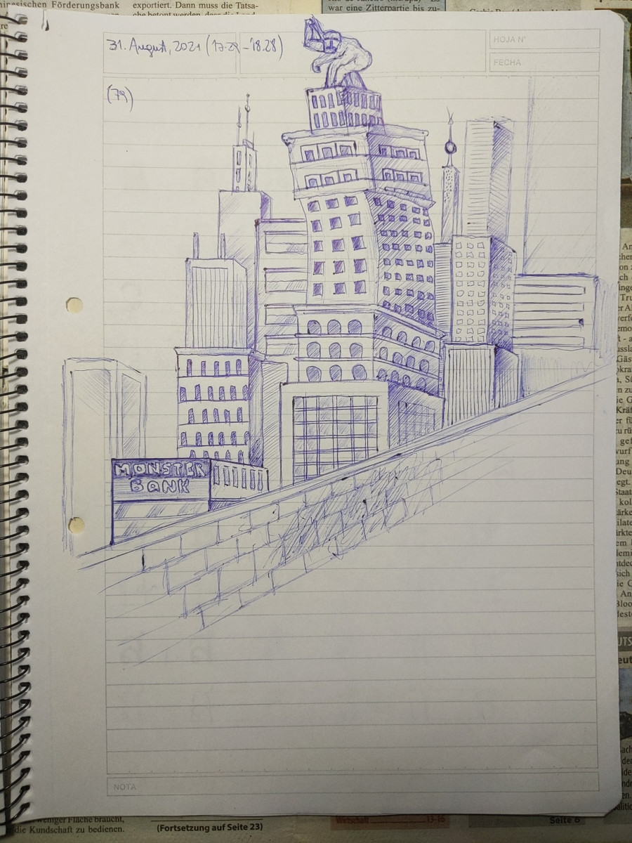 On Days 58 and 59 I worked on modern architecture designs. Lots of rounded forms mixed with trees and nature. Maybe it is indeed the architecture of the future! On Day 59 I also started the exercises on perspective. I did different sorts of designs to practice that, and, on Days 61 and 62 put that all together to draw a series of buildings and a street. That’s a strange building, with a few curves here and there that turn the image a bit unrealistic (on top of that, a gorilla playing on the highest tower).