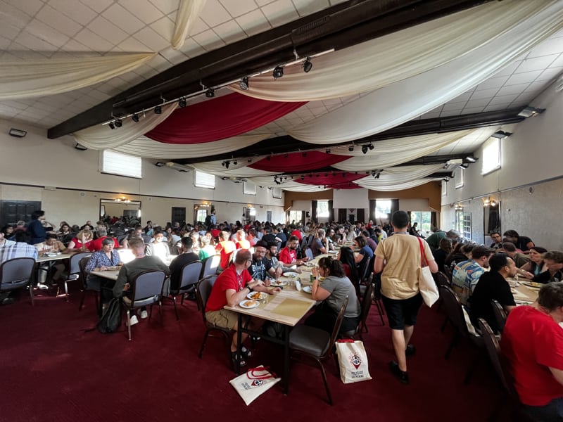 Upon registering for the gathering, attendees could specify their lodging preferences and meal plans. I, like most participants, chose a ticket that included lunch and dinner at the venue (in my case, I chose the vegan menu). That was very convenient to eat in the same place where we spent most of our time, and to socialize further with other participants. We had a large dining room all for ourselves: