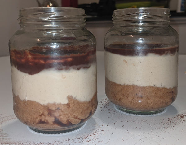I prepared them on these small jars, as I didn’t have the beautiful coffee cups of Cucina Botanica. The good thing about mine is that they are taller, so you get bigger portions 😁. For the first layer, I used vanilla cookies (“Cookids”, made by Cachafaz). The chocolate was semisweet (“Chocolate Águila”, the pink package). As for the plant-based milk, I used one made of almonds (“Amande”).
